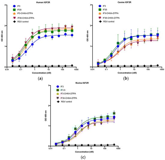 The recombinant human, mouse, and canine IGF2R were coated on a NUNC Maxisorp 96-well plate at 3 μg/mL concentration in PBS, with 50 μL (0.15 μg) added to each well. After being blocked with PB Buffer (1 × PBS + 0.2 mg/mL BSA) for an hour, the plate was washed twice with PT Buffer (1 × PBS + 0.05% Tween20). Purified IgGs (IF3 and IF3δ) were then added to the corresponding wells in concentrations ranging from 0.02 nM to 500 nM (1:3 dilution), and Palivizumab (IgG1) against the respiratory syncytial virus (RSV) was used as a negative control and incubated for 1 h with shaking. After washing four times with PT buffer, the plate was treated with a secondary antibody, Goat Anti-Human Kappa (K) Light Chain, HRP (Invitrogen, Waltham, MA, USA), diluted 1:5000 in PBT buffer. The plate was incubated for 45 min with shaking, then washed four times with PT buffer and developed with TMB 5,5′-Tetramethylbenzidine substrate for approximately 5 min. To terminate the reaction, 45 μL of 1 M Phosphoric acid was added to each well and read at 450 nm using a Biotek Synergy microplate reader.
