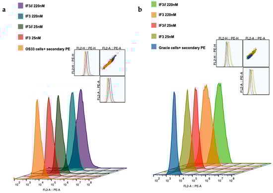 Binding of IF3 and IF3δ mAbs at different concentrations to human- and canine patient-derived OS cells using flow cytometry. (a) OS-33 (human); (b) Gracie (canine). Goat Anti-Human IgG PE was used as a secondary antibody. (The insert represents cell population).
