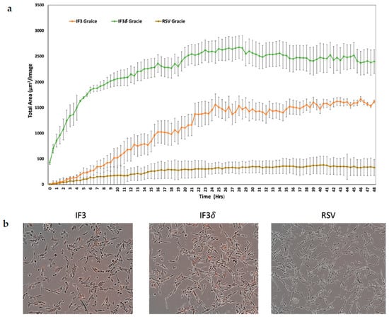 Cells of the Gracie OS type were seeded in a microplate with 96 wells, with a concentration of 4000–5000 cells per well in 50 μL of RPMI medium. After 24 h, the IncuCyte FabFluor Red Antibody Labeling Reagent was rehydrated using 100 μL of sterile water (final concentration: 0.5 mg/mL). The IF3, IF3δ, and RSV (Palivizumab) IgG1-negative control antibodies were mixed with the labeling reagent in a 1:3 molar ratio and then incubated at 37 °C for 15 min. The antibody–reagent mixture was added to the cells at a concentration of 4 μg/mL. The IncuCyte Live-cell Analysis System with a 10× objective captured images every 15 min for 48 h. The red fluorescent channel and software features were used to subtract the background fluorescence.