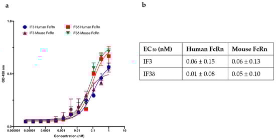 We investigated the binding of the IF3 and IF3δ (DHS mutation) antibodies to recombinant human and mouse FcRn receptors (R&D systems), specifically at pH 5.8. Using ELISAs, we measured the binding relative to wild-type IF3 and determined the IC50 values (Figure 4). Our results demonstrate strong IF3 and IF3δ antibodies binding to FcRn receptors at pH 5.8. Notably, the overall binding affinity between wild-type IF3 and IF3δ was comparable between human and mouse versions, indicating that the DHS mutation did not significantly affect the affinity towards a mouse version of FcRn, which can lead to improved half-life in mouse serum.