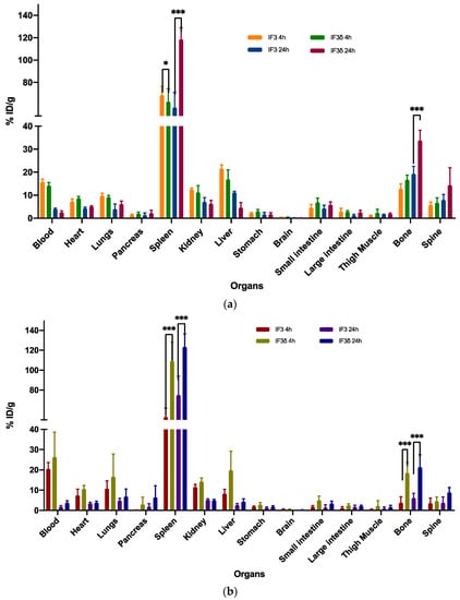 However, significant differences were observed in the accumulation of these antibodies in the spleen and bone. In the case of SCID mice, the IF3δ antibody exhibited a lower accumulation in the spleen (58.72%) compared to the IF3 antibody (68.70%) at 4 h post-administration. The accumulation of IF3δ antibodies in the spleen increased further at 24 h post-administration (106.92%), whereas the IF3 antibody accumulation remained relatively constant (51.62%). In the case of C57BL/6 black mice, the IF3δ antibody showed a significantly higher accumulation in the spleen (117.39%) compared to the IF3 antibody (48.79%) at 4 h post-administration. At 24 h post-administration, the accumulation of IF3δ in the spleen remained higher than the IF3 (103.31% vs. 51.62%).