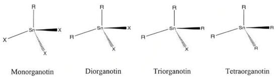 Tin, a group 14 post-transition metal, exists in two main oxidation states: tin (II) and tin (IV) [14]. Nevertheless, most of the known tin compounds are organotin (IV) derivatives, which are relatively more stable than their +II state, readily oxidized to their +IV state, and frequently polymerized [61]. Organotin compounds are formed when tin (Sn) bonds with carbon (C) atoms [20,23,62]. A general formula for these compounds is RxSn(L)4−x, where R represents an alkyl (such as methyl, ethyl, propyl, or butyl) or aryl (such as phenyl) group and L represents an organic or inorganic ligand [28,63]. Organotin compounds can be categorized based on the number of organic moieties on the Sn atom as mono-substituted, di-substituted, tri-substituted, or tetra-substituted (Figure 1) [28,31,43,64].