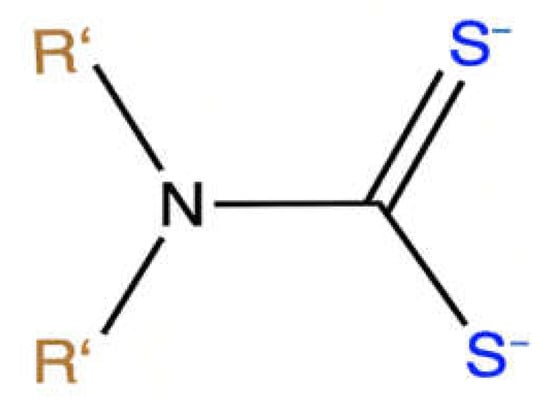 The dithiocarbamate anions with the generic formula -S2CNR′R″ (Figure 2) are the semi-amides of dithiocarbonic acids and sulfur analogs of carbamates (R2NCO2-) [65,66,67,68]. Since the 1940s, dithiocarbamates have been used as non-systemic pesticides to treat various fungal diseases in numerous crops and ornamental plants [69]. Moreover, these compounds and their derivatives are active agents in pharmacology, medicine, and biochemistry, and are extensively used in inorganic and organic chemistry. Their stability and interesting electrochemical and optical properties render them a valuable tool in research [70]. Previous studies have reported that the two donor sulfur atoms contribute significantly to the metal-binding capabilities of dithiocarbamate ligands [54,66]. These compounds possess well-known ligands that can firmly and selectively bind to a wide range of metal ions [66,71], making them extremely useful for a variety of medicinal and industrial applications.