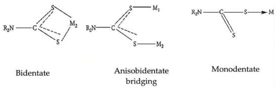 The local geometry around the Sn (IV) atom is affected by the chelation mode and coordination number of the dithiocarbamates [65,72]. Additionally, the binding properties of the metal ions determine the structure of the resulting metal complexes [54,73]. Dithiocarbamate can coordinate with the tin atom, relying on the coordination number of the Sn (IV) atom, which ranges from four to seven [65,72]. These compounds are bidentate (two S atoms bonded to the central metal atom or ion), anisobidentate bridging (one S atom bonded to the metal ion and the other S atom bridged to an adjacent molecule, forming dissimilar Sn-S bond distances), or monodentate (one S atom attached to the core of metal atom or ion) (Figure 3) [20,65,66,70,72,74,75,76]. However, as reported by Awang et al., these anions usually behave in a bidentate manner [70].