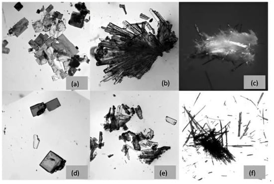 Deschamps (2010) suggested a similar technique for the crystallization of a small molecule that was used to produce a single crystal suitable for X-ray diffraction experiments [130]. Figure 6 shows a different type of crystal formation in which some compounds crystallize as thin plates that stick together or form stacks that appear to be single (a), which is unsuitable for X-ray diffraction. However, careful dissection (such as agglomeration) can yield useful single crystals (d). In addition, rapid crystal growth often results in the growth of many crystals from a single nucleation center, forming elongated or acicular crystals (b). They can also be separated to yield useful single crystals (e). Crystal forms resembling glass wool or dust balls (c) are among the least desirable. However, careful dissection can separate a single crystal from one of these undesirable forms (f). Crystals that are as small as 5 × 40 × 220 microns can be used for data collection [130,131].
