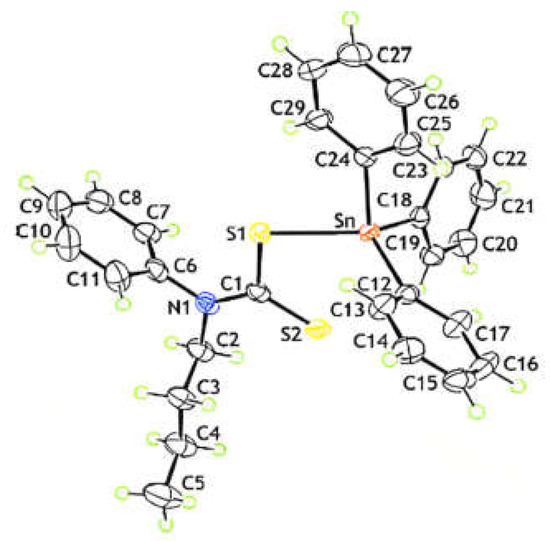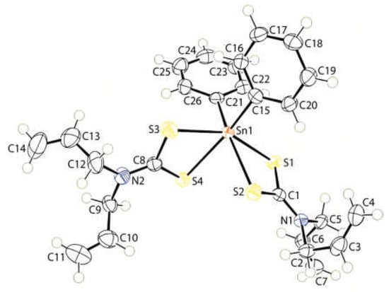 Tri-organotin (IV) complexes are often seen as having a tetrahedral or trigonal bipyramidal symmetry with distortions, regardless of the nature of the ligands attached to the Sn atoms [133]. The distortion arises as a result of the distance of the second uncoordinated sulfur, which forms a “pendant-like” structure [20]. As shown in Figure 7 and Figure 8, the complexes exhibit a distorted tetrahedral geometry around the Sn center [54,65]. The dithiocarbamate ligands are coordinated to the Sn atom in a monodentate manner because of the large disparity in the C–S bond distances. Consistently, the Sn-S bond distances are also non-equivalent for both complexes. The C–S bond angles for complex (C6H5)3Sn[S2CN(C4H9)(C6H5) are S1–C1 = 1.758(2) Å and S2–C1 = 1.675(2) Å, whereas the (C6H5)3Sn[S2CN(C2H5)(C6H5) complex with two independent molecules in the asymmetric unit has bond angles of S1-C1 = 1.759(2) Å; S2-C1 = 1.680(2) Å; S3-C28 = 1.7496(19) Å, S4-C28 = 1.6862(19) Å.