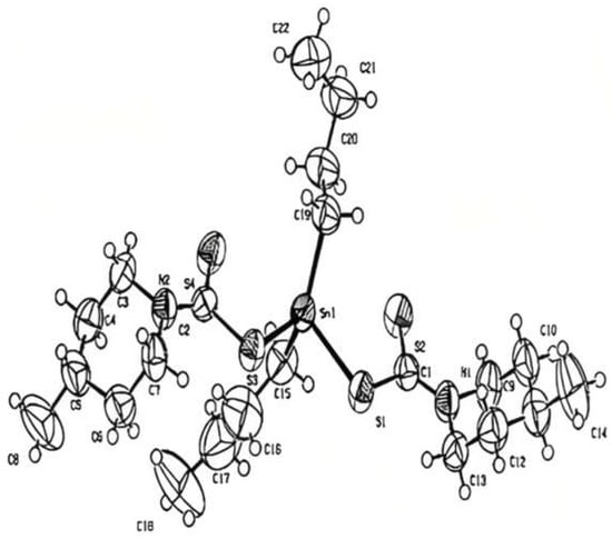 The crystal structure of 1,1-dibutyl-1,1-bis[(4-methyl-1-piperidinyl)dithiocarbamato)]tin (IV) (Figure 12) in an asymmetric unit with four coordination numbers for the Sn atom was previously reported [92]. The ligand dithiocarbamate bonds to the Sn atom through sulfur atoms (1) and (3), with Sn-S (1) = 2.534(12) Å and Sn-S (3) = 2.536(11) Å. The structural data suggest that the ligand is coordinated in a monodentate fashion, which is unusual for diorganotin (IV) substituents [20]. The Sn-S (2) and Sn-S (4) bond distances, which are 2.918(14) and 2.919(13) Å, respectively, are too long to be strong covalent bonds and are considered weak due to being shorter than the sum of the van der Waals radii for these atoms [109,140].