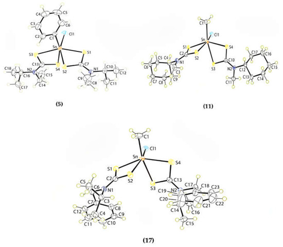 The monorganotin (IV) complex exhibits only distorted octahedral geometries, with the exception of the pentagonal pyramid geometry [127]. Muthalib and Baba [86] reported the structure of monorganotin (IV) complexes with the formulas of PhSnCl[S2CN(Et)(i-Pr)]2 (compound 5), MeSnCl[S2CN(Me)(Cy)]2 (compound 11) and MeSnCl[S2CN(i-Pr)(CH2Ph)]2 (compound 17) (Figure 13). These molecules have a distorted octahedral geometry, which is attributed to the bonding between the Sn atom and the CClS4 donor atom from the two chelating dithiocarbamate ligands. These three compounds have short Sn-S bond distances (from 2.5 to 2.7 Å), which indicate symmetric coordination modes [141]. The shortest Sn-S bond lengths (Sn-S1 = 2.5191(11) Å) observed in compound 5 might be due to the higher electronegative effect of the phenyl substituent.