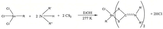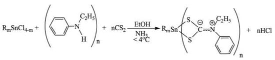 The schematic reaction between N-ethylaniline, carbon disulfide, and organotin (IV) chloride [65].
