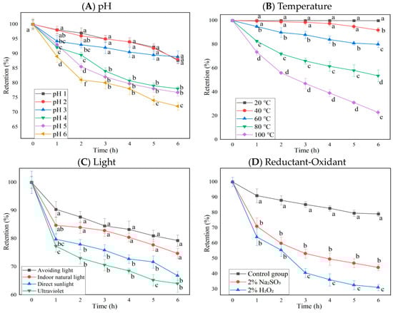 The influence of pH, temperature, light, and redox agents on the retention rate of blueberry anthocyanin extracts (BAEs) during six-hour storage. (A) pH: pH 1, 2, 3, 4, 5, and 6; (B) temperature: 20, 40, 60, 80, and 100 °C; (C) light: no light, indoor natural light, direct sunlight, ultraviolet light; (D) redox agent: 2% Na2SO3 and 2% H2O2. BAEs without an added redox agent were used as a control group. Data are represented as the mean ± standard deviation (SD, n = 3). Different lowercase letters indicate significant differences in BAE retention rate with different treatments at the same storage time (p < 0.05).