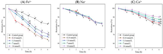 The influence of different ions and concentrations (0.14, 1.4, 7, 14 mmol/L) on the retention rate of blueberry anthocyanin extracts (BAEs) during six-hour storage. (A) Fe2+; (B) Na+; (C) Ca2+. BAEs without added ions were used as a control group. Data are represented as the mean ± standard deviation (SD, n = 3). Different lowercase letters indicate significant differences in BAE retention rate with different treatments at the same storage time (p < 0.05).