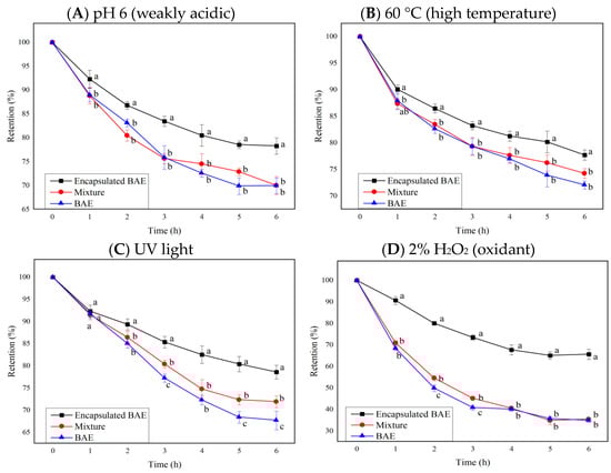 The influence of ferritin nanocarriers (encapsulated BAE nanoparticles and the unencapsulated mixture) on the retention rate of blueberry anthocyanin extracts (BAEs) during six-hour storage. (A) pH 6; (B) 60 °C; (C) ultraviolet (UV) light; (D) 2% H2O2. Data are represented as the mean ± standard deviation (SD, n = 3). Different lowercase letters indicate significant differences in BAE retention rate with different treatments at the same storage time (p < 0.05).