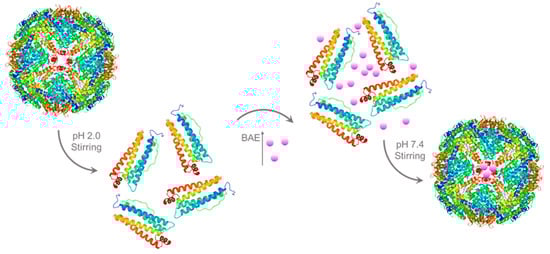 For encapsulated BAEs, the ferritin solution (2 μM) was adjusted to pH 2.0 by slowly adding 1.0 M hydrochloric acid and then incubating at 4 °C with magnetic stirring for 20 min to dissociate ferritin into free subunits. Afterward, 10 mM BAE was slowly added to a 2 μM protein carrier solution in a volume ratio of 1:11 and placed in a beaker packed with tinfoil in darkness. The pH was adjusted to neutral with 1.0 M NaOH, and the solution was stirred in the dark for 2 h. After stirring, the solution was placed into PBS buffer (pH 7.4) for dialysis for 24 h to remove free BAE (molecular weight cutoff (MWCO) = 12,000–14,000 Da). After that, BAE was encapsulated in a ferritin carrier to obtain the nanoparticle (2 μM). The preparation process of encapsulated BAEs is shown in Figure 6 (The X-ray crystallographic structure of ferritin was obtained from the Protein Data Bank (http://www.rcsb.org/pdb, accessed on 27 July 2023). The ferritin structure was drawn by RasMol 2.6.