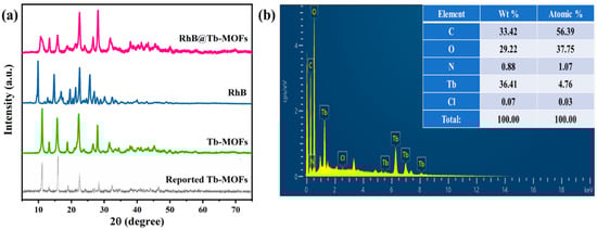 (a) XRD patterns of the reported Tb-MOFs, synthetic Tb-MOFs, RhB and RhB@Tb-MOFs (RhB: 0.44%); (b) EDX spectrum of the RhB@Tb-MOFs.