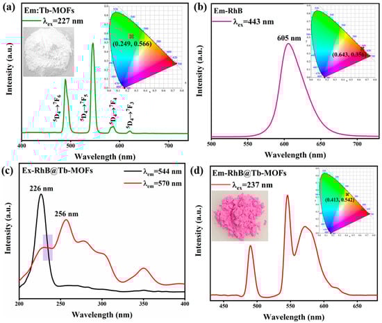 The emission spectra of the Tb-MOFs are shown in Figure 2a. The CIE coordinate of (0.249, 0.566) is located in the green region, indicating that Tb-MOFs were green-emitting materials. As shown in Figure 2b, the RhB exhibited a characteristic red light emission peak centered at 605 nm, which is consistent with the reported RhB spectrum. The excitation spectra of the RhB@Tb-MOFs (Figure 2c) show ligand absorption and RhB absorption located at 226 nm and 256 nm, respectively, and these two peaks overlapped at 237 nm. The emission spectra of RhB@Tb-MOFs are shown in Figure 2d, which contains the characteristic emissions of Tb3+ and RhB (blue-shift due to concentration and solvation effects [45]), indicating that the RhB@Tb-MOFs were successfully prepared. The color of the powder changed from white (Tb-MOFs) to purplish red (RhB@Tb-MOFs). The corresponding CIE coordinate of the RhB@Tb-MOFs was (0.413, 0.542), which lies between the green and red regions, indicating that the RhB@Tb-MOFs belonged to the green-red dual-emission composites.