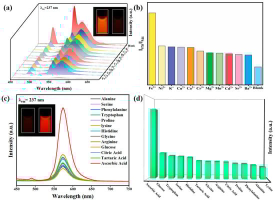 (a) Emission spectra of the RhB@Tb-MOFs added with different metal ions (10−3 M) in aqueous solution, where the inset shows the RhB@Tb-MOFs before and after detection of Fe3+ ions with 254 nm UV light; (b) I570/I544 of the RhB@Tb-MOFs containing different metal ions; (c) emission spectra of the Fe3+/RhB@Tb-MOFs added with different biomolecules (10−3 M), where the inset shows the Fe3+/RhB@Tb-MOFs before and after the detection of AA; (d) histogram of the luminescence intensity at 570 nm for the Fe3+/RhB@Tb-MOFs containing different biomolecules.