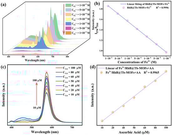 (a) The RhB@Tb-MOFs in response to different concentrations of Fe3+; (b) relationship between the I570/I544 of the RhB@Tb-MOFs and the Fe3+ concentration; (c) the Fe3+/RhB@Tb-MOFs in response to different concentrations of AA; (d) relationship between fluorescence intensity located at 570 nm and the AA concentration.