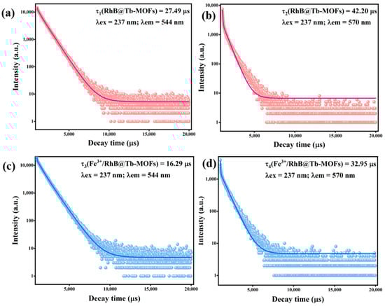The fluorescence lifetime is another important verification to explore mechanism, the fluorescence lifetime tests were performed on the RhB@Tb-MOFs and Fe3+/RhB@Tb-MOFs. Figure 5a,b show the fluorescence lifetimes of the RhB@Tb-MOFs at 544 nm (τ1 = 27.49 μs) and 570 nm (τ2 = 42.20 μs). The fluorescence lifetimes of the Fe3+/RhB@Tb-MOFs were τ3 = 16.29 μs and τ4 = 32.95 μs at 544 nm and 570 nm (Figure 5c,d), respectively, both with reduced fluorescence lifetimes compared with the RhB@Tb-MOFs. The fluorescence lifetime was shortened due to the collision between the fluorophore and the quencher [46], indicating that the detection mechanism of the RhB@Tb-MOFs for Fe3+ was a dynamic quenching process.
