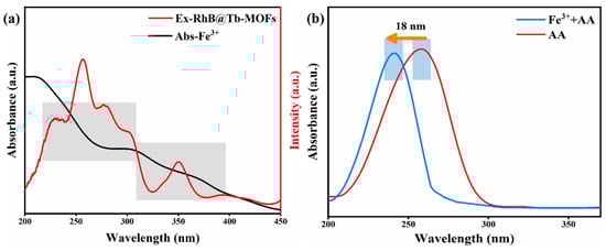 The internal filtration effect (IFE) is one of the mechanisms of fluorescence quenching and has been widely used in biochemical assays. As shown in Figure 6a, the excitation spectra of RhB@Tb-MOFs and the UV absorption spectra of Fe3+ were tested, which overlapped in the short-wavelength range of 200~400 nm, and the energy transferred from the matrix to the luminescence center was absorbed by Fe3+, suggesting that the detection of Fe3+ fluorescence quenching was likely due to the IFE [44,47]. In addition, the mechanism of the fluorescence recovery of RhB after the detection of AA by the Fe3+/RhB@Tb-MOFs was investigated by testing the UV-Vis absorption spectra of the AA solutions and a mixture of AA+Fe3+. As shown in Figure 6b, the UV-Vis absorption spectrum of the mixed AA+Fe3+ solution was blue-shifted by 18 nm toward the shortwave wavelength compared with the AA solution, indicating a correlation reaction between the Fe3+ and AA, which ultimately led to the recovery of fluorescence of the RhB [1].