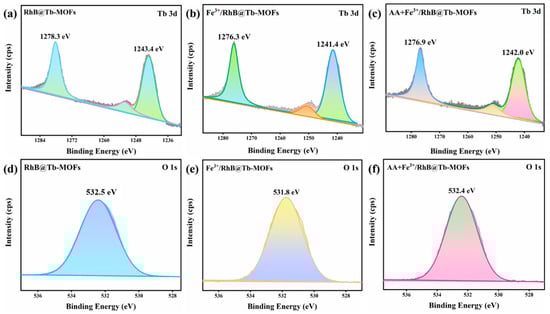 (a) The XPS peaks of Tb 3d in the RhB@Tb-MOFs; (b) the XPS peaks of Tb 3d in the Fe3+/RhB@Tb-MOFs; (c) the XPS peaks of Tb 3d in the AA+Fe3+/RhB@Tb-MOFs; (d) the XPS peaks of O 1s in the RhB@Tb-MOFs; (e) the XPS peaks of O 1s in the Fe3+/RhB@Tb-MOFs; (f) the XPS peaks of O 1s in the AA+Fe3+/RhB@Tb-MOFs.