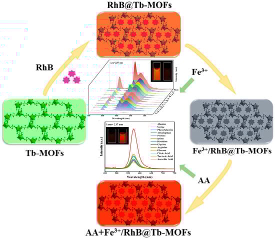 Schematic diagram of the RhB@Tb-MOFs for the continuous detection of Fe3+ and AA.