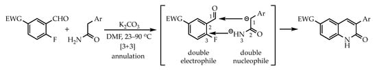 The current study reports the use of a domino aldol-SNAr-dehydration reaction to prepare quinolin-2(1H)-ones and 1,8-naphthyridin-2(1H)-ones via the [3+3] annulation (Figure 1) of a double nucleophile (a 2-arylacetamide) with a double electrophile (an SNAr-activated 2-fluorobenzaldehyde or 2-fluoronicotinaldehyde). The aromatic aldehydes are commercially available or easily prepared. The arylacetamides are relatively scarce and expensive to purchase but can be readily synthesized from the corresponding 2-arylacetyl chlorides. The current transformation represents the first use of an activated acetamide to construct potential drug candidates.