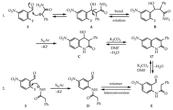 As briefly mentioned above, two mechanisms for the formation of the target heterocycles are plausible, differing in the initial bond-forming step (see Scheme 1). Since the pKa values for the pseudo-acidic methylene and amido groups of the 2-arylacetamides are comparable, it might be expected that the anion from either site could initiate the sequence. These pKa’s were estimated from experimentally derived values for PhCH2CO2Et (22.6), PhCONH2 (23.3), CH3CONH2 (25.5) and PhCH2CONH2 (unclearly listed as 24.7) in DMSO [24]. Computer-estimated pKa’s were similar but trended slightly more acidic than the experimental values [25]. Mechanism 1 requires an initial aldolization between the arylacetamide methylene anion and the benzaldehyde to yield aldol conformers A (possibly H-bond stabilized) and B. SNAr ring closure from conformation B would then give the fused-ring β-hydroxyamide, which upon loss of water would afford the quinolin-2(1H)-one. Interestingly, the ring closure in this sequence could occur from either the enolate oxygen or the amide nitrogen. However, as one might expect, cyclization by nitrogen prevails since the quinolin-2(1H)-one product has greater stability than the alternative 2H-chromen-2-imine. For quinolin-2(1H)-ones, it is well known that the amide structure predominates over the quinolinol tautomer [26,27], and with its 10 π electron complement and planarity (all atoms are sp2 hybridized) retains its aromaticity [28]. A similar preference likely applies in the 1,8-naphthyridin-2(1H)-one series. Mechanism 2, involving the addition of the amide nitrogen anion to the aromatic ring, offers an alternative route to the final products. We have shown in the past that primary amides give high yields of SNAr products in DMF [29], but usually require heat for efficient reaction. In this scenario, the less hindered amide rotamer D would be expected to predominate, necessitating a conversion to the more sterically challenged rotamer E before ring formation could occur. To gain insight into the initiating reaction of the sequence, two reactions were run on substrates bearing similar functionality to those used to prepare quinolin-2(1H)-ones. The first, between phenylacetamide and 2-nitrobenzaldehyde in DMF with K2CO3 at room temperature (23 °C), formed two inseparable polar products (by TLC) with loss of the aldehyde carbonyl (IR). The second, employing phenylacetamide with methyl 2-fluoro-5-nitrobenzoate under the same conditions, did not show significant conversion until heat (>50 °C) was applied. While these observations do not have direct relevance in the current application, they strongly suggest that the aldehyde is the most reactive functional group. Since the reaction is stirred at 23 °C for 15–30 min prior to the application of heat, the sequence of events likely begins with aldol formation as in mechanism 1.