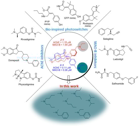 In this context, we have combined the expertise in the synthesis and characterization of biomimetic light-controlled molecular switches and motors [30,31,32,33,34,35,36] and in the design of ChE-Is [37,38,39], which have recently led to a small series of photoisomerizable donepezil-like compounds with on-off inhibitory activity towards AChE and MAO-B [40]. These molecules consist of a diversely decorated indanone moiety linked to an N-benzyl-N-ethylethanamine group via an isomerizable carbon-carbon double bond. Their irradiation leads to the spatial repositioning of the key pharmacophore features responsible for the interactions in the binding sites of the target enzymes.