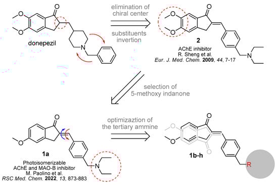 From a pharmacological point of view, the structure of parent compound 1a can be traced back to the well-known anti-Alzheimer drug donepezil. This molecule has a 5,6-methoxyindanone unit linked to an N-benzylpiperidine moiety via a chiral center. By manipulating this structure, Sheng and coworkers discovered non-chiral compounds with AChE-inhibitory activity comparable to donepezil [41]. Specifically, they replaced the chiral center with an exocyclic double bond and reversed the position of the benzyl ring with the basic center (e.g., compound 2, Figure 2). In our previous study, focusing on dual AChE/MAO-B inhibitors, the effect of methoxy groups on the interaction with the two enzymes was investigated. We found that removing the 6-OMe group of the indanone moiety resulted in a molecule with submicromolar inhibitory activity for both target enzymes [40]. Thanks to the presence of the hemiindigoid chromophore [42,43], this molecule is able to reversibly photoisomerize by the application of UV light and spatially shift the functional groups responsible for the interaction in the binding sites of the two enzymes. Among the key pharmacophore features, the tertiary amino residue plays a first-rate role by interacting at the catalytic anionic site (CAS) site of AChE, anchoring the inhibitor in the enzyme gorge. Photoisomerization of the exocyclic double bond leads to the displacement of the indanone carbonyl, and the 5-OMe group alters their interactions in the middle of the binding gorge and at the peripheral anionic site (PAS).