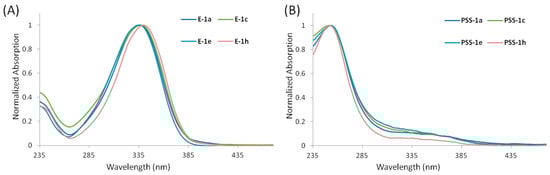 (A) Normalized UV-Vis absorption spectra of methanolic solutions of compounds E-1a,c,e,h. (B) Normalized UV-Vis absorption spectra of methanolic solution of compound 1a,c,e,h at PSS generated by UV-B irradiation.