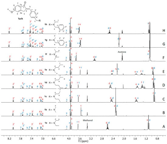 1H NMR spectra (400 MHz) of the E/Z mixtures obtained at the PSSs after irradiation with UV-B light of compounds 1a–e (spectra A–E) in methanol-d4 and of compounds 1f–h (spectra F–H) in acetone-d6. Blue numbering was used for assignment of the E diastereomers, while red numbering was used for the Z isomers.
