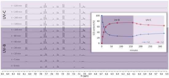 As an example, Figure 5 shows the photoconversion kinetics obtained by irradiating 1c (10 mM in methanol-d6) in a Pyrex NMR tube using a multi-ray chamber equipped with two lamps (15 Watt GT15T8 Hg UV-B tube) at a temperature of 24 °C in continuous rotation. The solution was irradiated with UV-B light until reaching the PSSUV-B (almost completed in 50–80 min). Subsequently, the PSSUV-B solution was irradiated under the same conditions with UV-C light generated using two lamps (15 Watt GT15T8 Hg UV-C tube), observing the photoconversion of the cis isomer into the trans isomer without the appearance of photodegradation.