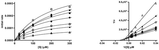 Inhibition kinetics (left) and Lineweaver–Burk plot (right), r2 = 0.983–0.999 for hAChE (0.2 U/mL) and E-1h (0–500 nM), using different substrate (acetylthiocholine iodide) concentrations (50–300 μM). The replot (r2 = 0.997) of the slopes versus [I] determined the Ki (100 nM) as the x-axis intercept (see Supplementary Information). (○) no inhibitor, (●) 10 nM, (■) 25 nM, (◆) 50 nM, (◇) 100 nM, (▲) 200 nM, (△) 500 nM.