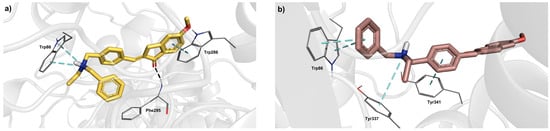 Glide top-ranked docking poses of (a) E-1h (docking score = −13.172 kcal/mol, ligand efficiency = −0.439) and (b) Z-1h (docking score = −11.494 kcal/mol, ligand efficiency = −0.383) in complex with hAChE (PDB 4EY7; donepezil: docking score = −13.117 kcal/mol, ligand efficiency = −0.468). The diastereoisomer ligands are depicted as sticks; the interacting residues are rendered as lines, while protein is represented as a cartoon. Dashed black lines represent H-bond; meanwhile, π-π and π-cation interactions are indicated by dashed cyan lines.