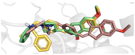 Superimposition of E-1h (yellow sticks), Z-1h (violet sticks), and donepezil (green sticks) as docked in the top-scored poses (E/Z-1h) or established by the X-ray crystal structure (donepezil) within the AChE binding site.