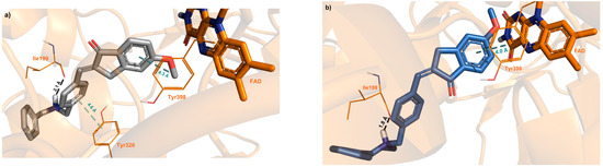 Glide top-ranked docking poses of (a) E-1h (grey stick, docking score = −10.129 kcal/mol, ligand efficiency = −0.338) and (b) Z-1h (blue stick, docking score = −12.256 kcal/mol, ligand efficiency = −0.409) in complex with hMAO-B (PDB 2V5Z; safinamide: docking score = −10.428 kcal/mol, ligand efficiency = −0.474). The diastereoisomer ligands are depicted as sticks; the interacting residues are rendered as lines, while protein is represented as cartoons. Dashed black lines represent H-bonds; meanwhile, π-π and π-cation interactions are represented as dashed cyan lines. FAD coenzyme is shown in orange sticks.