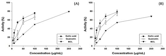 Antioxidative potential of Bambusae caulis in Liquamen (BCL). Free-radical-scavenging assays using (A) 2,2-diphenylpicrylhydrazil (DPPH) and (B) 2,2′-azino-bis (3-ethylbenzothiazoline-6-sulfonic acid (ABTS) of gallic acid, quercetin, and BCL. Experiments were performed in triplicate and repeated three times with similar results.