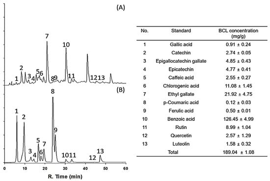 The BCL was analyzed quantitatively using HPLC-DAD (SPD-20A, Shimadzu Co., Japan). Thirteen standards ((1) gallic acid, (2) catechin, (3) epigallocatechin gallate, (4) epicatechin, (5) caffeic acid, (6) chlorogenic acid, (7) ethyl gallate, (8) p-coumaric acid, (9) ferulic acid, (10) benzoic acid, (11) rutin, (12) quercetin, and (13) luteolin) were selected for experiments, and HPLC analysis conditions were as follows: Shim-pack GIS-ODS column (C18, 4.6 × 250 mm, 5.0 μm, Shimadzu Co.), flow rate of 0.7 mL/min, temperature 30 °C, injection volume 20 μL, and a UV detector wavelength of 280 nm. For the mobile phase, 0.1% acetic acid in water (solvent A) and 0.1% acetic acid in methanol (solvent B) were used. The gradient conditions of the mobile phase were 0 min: B (10%), 0–5 min: B (10%), 5–15 min: B (40%), 15–45 min: B (60%), 45–55 min: B (80%), 55–60 min: B (100%), 60–65 min: B (10%), 65–70 min: B (10%). The injection volume was 20 μL. All samples used for analysis were filtered with a 0.45 µm filter. These data were obtained through the company SUMSUMBIO. Co., Ltd.