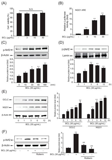 The assay using 3-(4,5-dimethylthiazol-2-yl)-2,5-diphenlyltetrazolium bromide (MTT) showed that BCL up to 30 μg/mL concentration was not cytotoxic for HepG2 cells (Figure 3A). Nrf2-target genes contain AREs in the promoter region. AREs were initially identified as cis-regulatory elements for NADPH quinone dehydrogenase 1 (NQO1) and glutathione S-transferase (GST) genes [17,18]. To examine the effect of BCL on Nrf2 activity, the luciferase activity of NQO1-ARE following treatment with BCL was measured. BCL increased the luciferase activity of NQO1-ARE (Figure 3B). Moreover, the effects of BCL on increasing the phosphorylation and nuclear translocation of Nrf2 were investigated. The nuclear translocation and activation of Nrf2 are modulated by post-translational modifications, mainly phosphorylation. Phosphorylated Nrf2 translocates to the nucleus and increases the expression of its target genes [19]. Treatment with BCL gradually increased the Nrf2 phosphorylation from 10 min to 3 h. The nuclear translocation of Nrf2 peaked at 3 h of treatment with BCL and then decreased (Figure 3C,D).