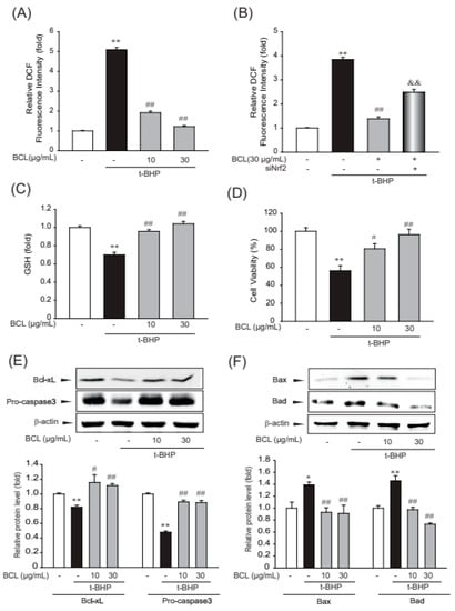 To determine the inhibitory effects of BCL on oxidative stress, ROS production and intracellular levels of reduced glutathione (GSH) were measured [20]. BCL inhibited tBHP-induced ROS production via Nrf2 and maintained the level of intracellular GSH that was reduced by treatment with tBHP (Figure 4A–C). Oxidative stress caused by ROS production plays a major role in cellular apoptosis [21]. To investigate whether BCL can reduce cellular apoptosis, cell viability was determined using the MTT assay and analyzing the expression of inducible proteins (Bax, Bad, Bcl-xL, and procaspase 3) that are markers of the canonical apoptosis pathway. Treatment with BCL reduced tBHP-induced cell death and the expression of Bax and Bad in a dose-dependent manner (Figure 4C,D). Moreover, BCL recovered the expression of Bcl-xL and procaspase 3 (Figure 4E). These results indicate that BCL can reduce cell death by inhibiting tBHP-induced oxidative stress in HepG2 cells.