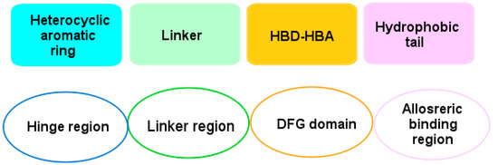 Important pharmacophoric features of protein kinase inhibitors and different regions in the ATP-binding site. Hing region, linker region, DFG domain, and allosteric-binding region are the main binding sites in the target kinase enzymes.
