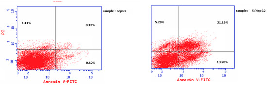 Flow cytometry analysis of apoptosis in HepG2 cells treated with compound 5. HepG2 were treated with compound 5 or with no treatment and Dual-stained with Annexin V-FITC and PI for detection of apoptotic cells.