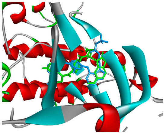 Alignment of compound 5 (green) with erlotinib (blue) in the active site of EGFR.