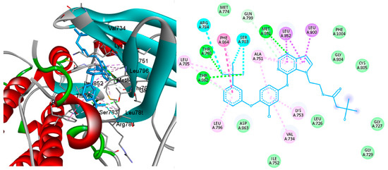 Schematic of 3D and 2D interactions of compound 5 with the active site of EGFR. Green dotted lines represent hydrogen bonds.