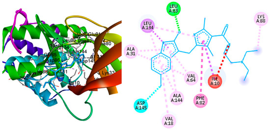 Fourth, compound 5 and sunitinib were docked into the active site of CDK2. Figure 14 depicts the alignment of the two compounds in the ATP-binding site of the CDK2 enzyme. It is notable in Figure 15 and Figure 16 that both compounds made similar types of hydrophobic interactions. Compound 5 was stabilized by three hydrogen bonds with Glu81, Lys89, and His84, as compared to sunitinib, which was only stabilized by one hydrogen bond with Leu88.