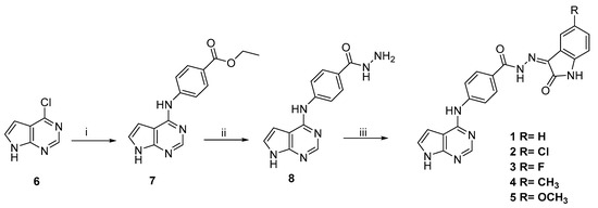 Design of isatin–deazapurine hybrid compounds 1–5. Reagents and conditions: i. Ethyl 4-aminobenzoate, abs. EtOH, reflux, 7 h. ii. N2H2. H2O, abs. EtOH, reflux, 5 h. iii. Appropriate isatin, AcOH, EtOH, reflux, 6–9 h.
