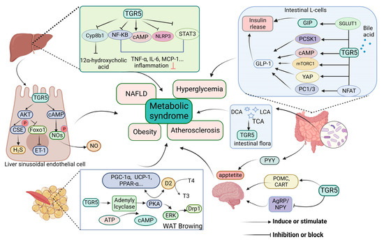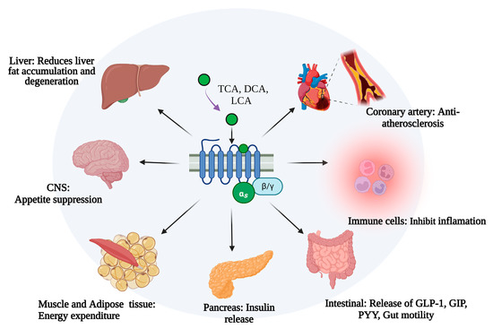 Takeda G protein-coupled receptor 5 (TGR5, GPBAR1, M-BAR, or GPR131) is a bile acid membrane receptor and a member of the G protein-coupled receptor subfamily. TGR5 can influence bile acid composition and enterohepatic circulation [5]. Accumulated evidence has demonstrated that TGR5 plays special roles in lipid and glucose metabolism, energy homeostasis, and immune and anti-inflammatory regulation [6,7,8,9]. TGR5 is widely expressed in the liver, intestine, pancreas, central nervous system, and immune cells [10]. TGR5 activation by bile acids can influence lipid, glucose, and energy metabolism (Figure 1). Hepatic TGR5 acts as a suppressor of lipid accumulation in the liver by regulating the bile acids composition and enterohepatic circulation [11,12]. Mouse models with MS have illustrated that the activation of TGR5 could promote insulin secretion and insulin sensitivity [13,14]. TGR5 is also involved in neuronal regulation in the central system to influence food intake and body weight [15]. Studies using tissue-specific mice have revealed that TGR5 could increase energy expenditure in skeletal muscle and adipose tissue [16,17]. TGR5 also involves in the pathogenesis of atherosclerosis by regulating the secretion of vasodilators and vasoconstrictors [18,19] (Figure 1).