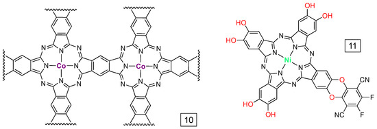 Two reports of PcCo immobilized on CNTs from different groups appeared nearly simultaneously in 2017, though the approaches used to generate the materials were distinct [46,60]. In reference [46], the PcCos were prepared via microwave-assisted condensation directly onto CNT substrates using 1,2,4,5,-tetracyanobenzene and CoCl2. The result of the condensation is a core-sheath arrangement with the CNT at the core and a crosslinked PcCo material as the sheath; an example of a crosslinked subunit is shown in Figure 6, i.e., 10. The thickness of the PcCo material was ca. 5 nm and the weight percent of cobalt in the materials was about 2.6%. The other material [60] was made from DMF suspensions of PcCo and CNTs, where the PcCo is anchored via non-covalent (likely π–π) interactions. In this case, the cobalt weight percent was about 0.26%. Of special note is that both systems achieve similar overpotentials and turnover frequencies (ca. 1–5 s−1). This observation highlights the importance of per-site activity; the crosslinked PcCo-CNT system has a factor of 10 more Co to achieve the same overall activity.