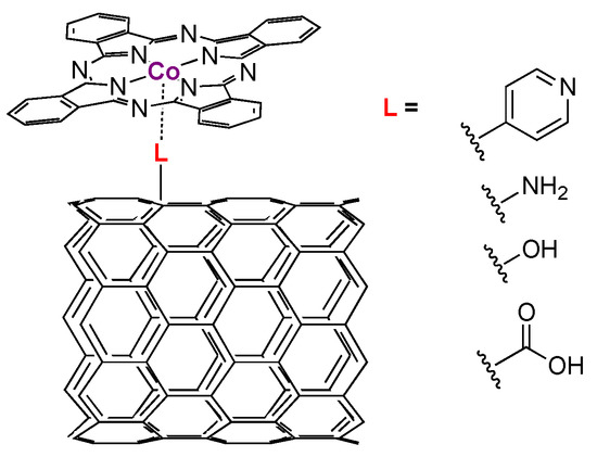 Other approaches to immobilizing PcCo onto CNTs involve initial modification of the CNTs with functional groups that can act as ligands to the open axial sites in PcM complexes (Figure 7). Such additional ligands can affect the properties of the metal site, as described below in the cases of PcCo encapsulated in ligating polymers. Addition of pyridine to CNTs and addition of PcCo gives rise to materials that support CO2-to-CO conversion [62]. The pyridine groups aid in both dispersing the PcCo and in tuning the electronic properties of the Co site. In comparison to other dispersed PcCo [45], the reported rate constants are about a factor of three faster. At higher PcCo loadings, the rate constants become independent of deposition of CNTs or macroscopic substrates, reinforcing the idea that aggregation and occlusion of active sites is a crucial consideration of PcM preparations. CNTS also can be modified to include -COOH, OH, or NH2 groups along their backbone (Figure 7) [63]. All three of those groups promote better dispersity and therefore better CO2 reduction activity, but the NH2-modified CNTs show the overall best kinetics. Interestingly, the turnover frequencies for the NH2- and pyridine-modified CNTs are about the same (ca. 30 s−1). In both of the above examples, the Tafel slopes are near 120 mV per decade, suggesting that an electron transfer is rate limiting and, in contrast to higher loadings, transport limitations are absent.