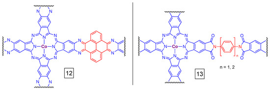 Covalent organic frameworks (COFs) are a class of two-dimensional materials where subunits are connected via covalent bonds; the basics of COF chemistry are reviewed elsewhere [65]. COFs share some similarities to metal-organic frameworks (MOFs), where the latter is distinguished by their assembly using metal–ligand coordinate bonding and thus includes the presence of heavier elements/metal centers as components/linkers of the network. The preparation of covalent- and metal-organic frameworks based on metalloporphyrins [66,67] spurred research into the corresponding PcM-based materials. Some of the first examples were not designed as catalysts, but were of interest as conductors/semiconductors (e.g., [68,69]). One of the first examples of a CO2 reduction system derived materials from crosslinked 2,3,9,10,16,17,23,24-octaaminophthalocyanine Co(II) and 4,5,9,10-pyrenediquinone (12 in Figure 9) [70]. The material displayed near perfect (96%) Faradaic efficiency for conversion of CO2 to CO at rates of approx. 3 s−1. The Tafel slopes suggest that electron transfer was rate-limiting, not mass transport. Similarly, two-dimensional sheets of polyimide-linked PcCo (13 in Figure 9) show good Faradaic efficiency for CO production in an overpotential-dependent manner (70–90+%) and have turnover frequencies of ≥2 s−1 [71]. Those materials also have chemical stability in concentrated HCl and thermal stability to ca. 300 °C.